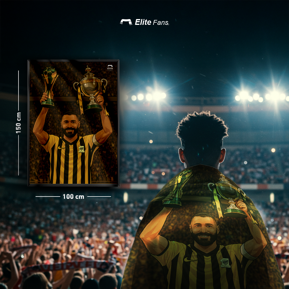 - التصميم: صورة حماسية للنجم كريم بنزيما بشعار نادي الاتحاد ولمسات فنية رياضية